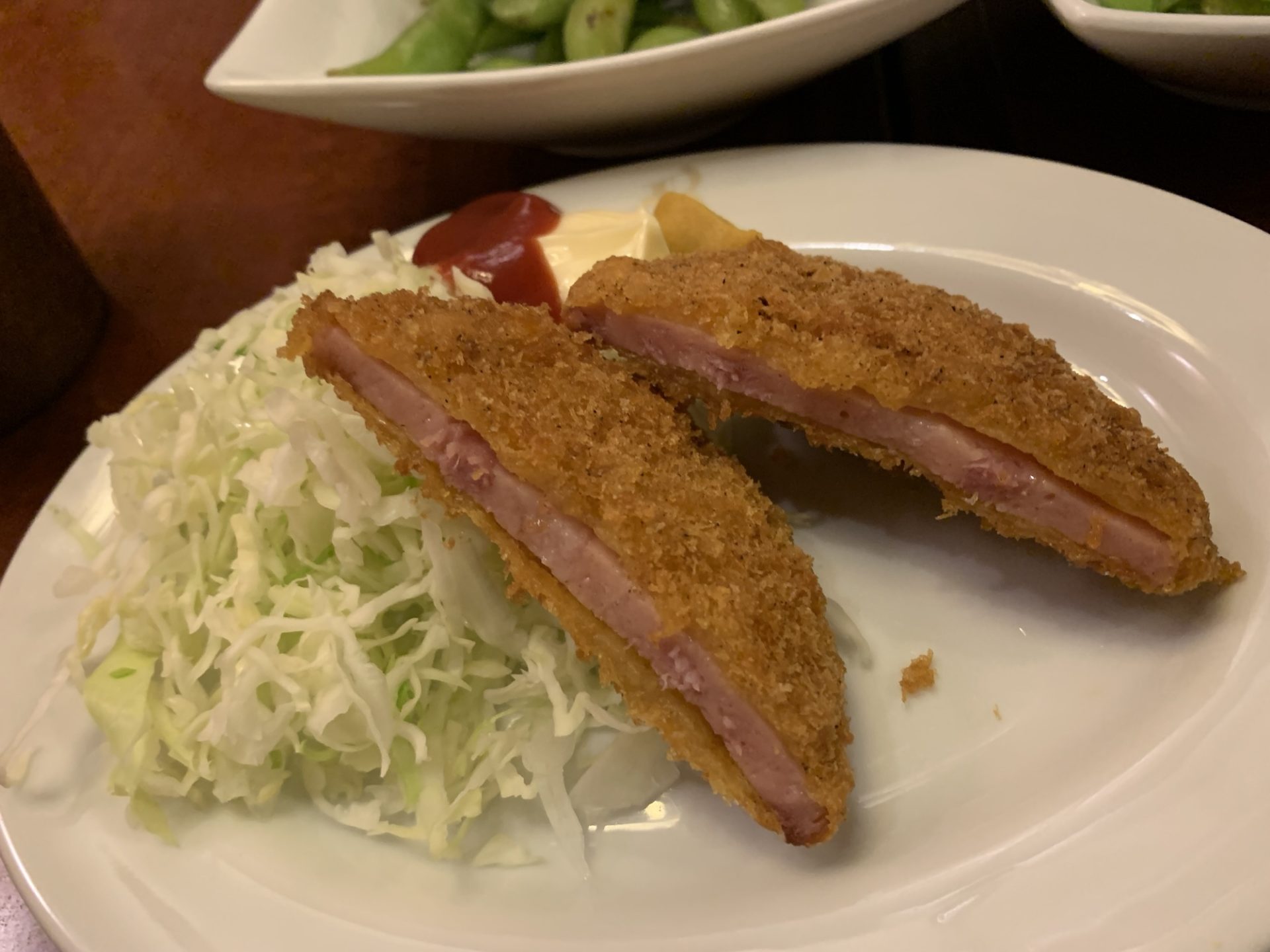箸を入れると、衣がザクッ!と快音を立て、中から薄切りながらも存在感のあるハムが顔を出す。
