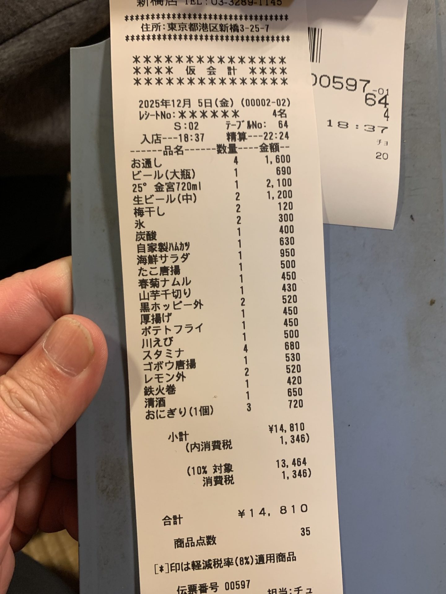 レシートが長い=幸せの証: 35点もの注文が並ぶレシートは、もはや勲章。4人でこれだけ笑って食べて、この値段は店主の懐具合が本気で心配になる。